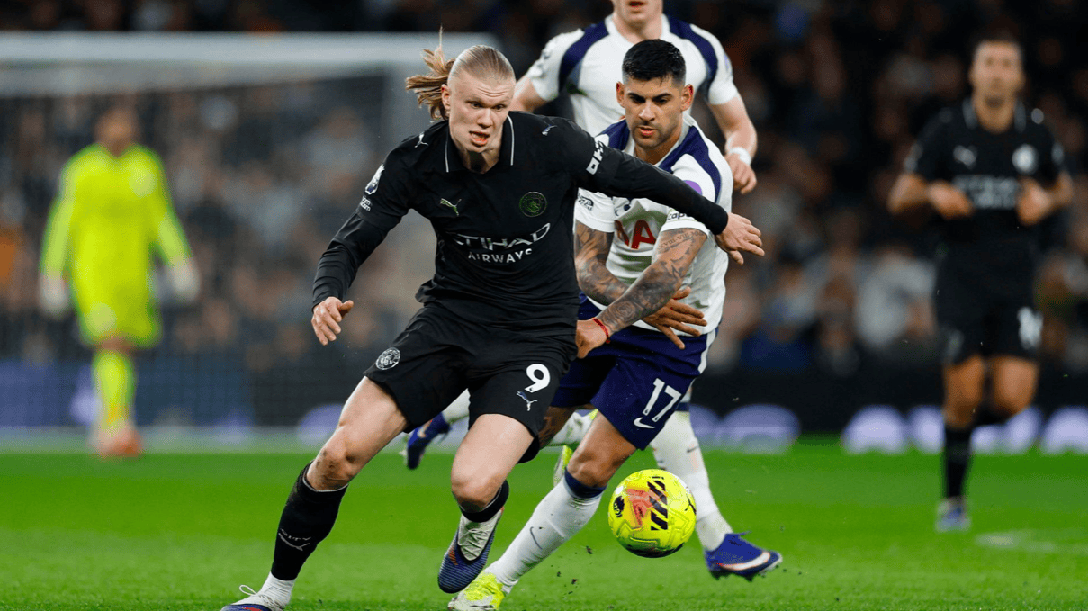 7分钟后,曼城还有机会,罗德里的长传打穿热刺防线,哈兰德不停球直接挑射,皮球越过维卡里奥,砸在球网上方。